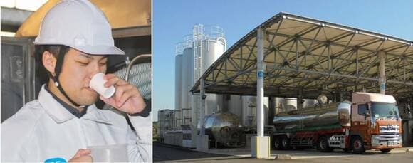 専用のタンクローリーが各牧場を回り、集乳前に生乳の品質を検査。検査をクリアした生乳はクーラーステーション(大型冷蔵貯乳施設)へと運ばれたのち、受入検査をしてから一時冷却保管。その後、乳業メーカーの工場まで運ばれます。