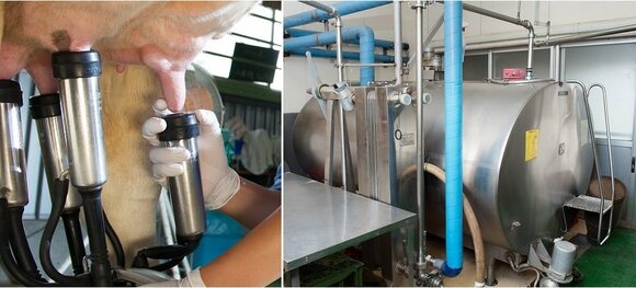 搾乳時は牛の乳頭をキレイにふき、乾燥させてから搾乳機で搾ります。鮮度を保つため、搾乳したあとは外気に触れることなく、生乳はバルククーラー(生乳冷却装置)で一時保管されます。
