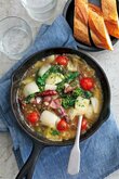 (2) スキレットもしくは小さめのフライパンにニンニク、赤唐辛子、オリーブオイルを入れ、弱火にかける。