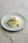 (5) (4)が熱いうちに(1)とからめ、(2)も加えてさらにからめる。味をみて、たりなければ塩で味をととのえ、コショウ、パセリをふる。