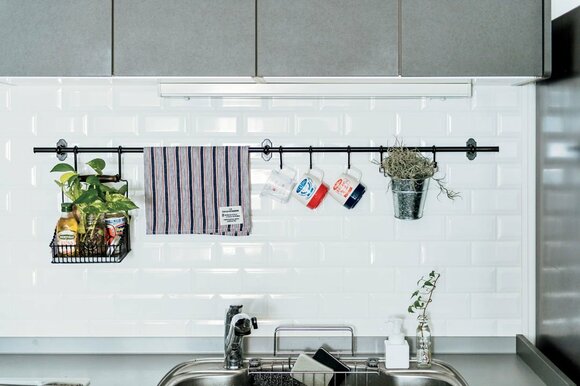 グリーンやバーを上手に使い、無理なくおしゃれなキッチンをキープしています。