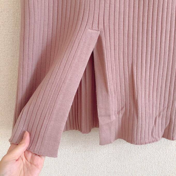 すべての画像を見る(全7枚)GU新作の「ワイドリブニットナロースカート」はブラック、ベージュ、ピンク、ブラウン、オリーブ、ブルーの6色展開で価格は1990円。こちらはピンクです。