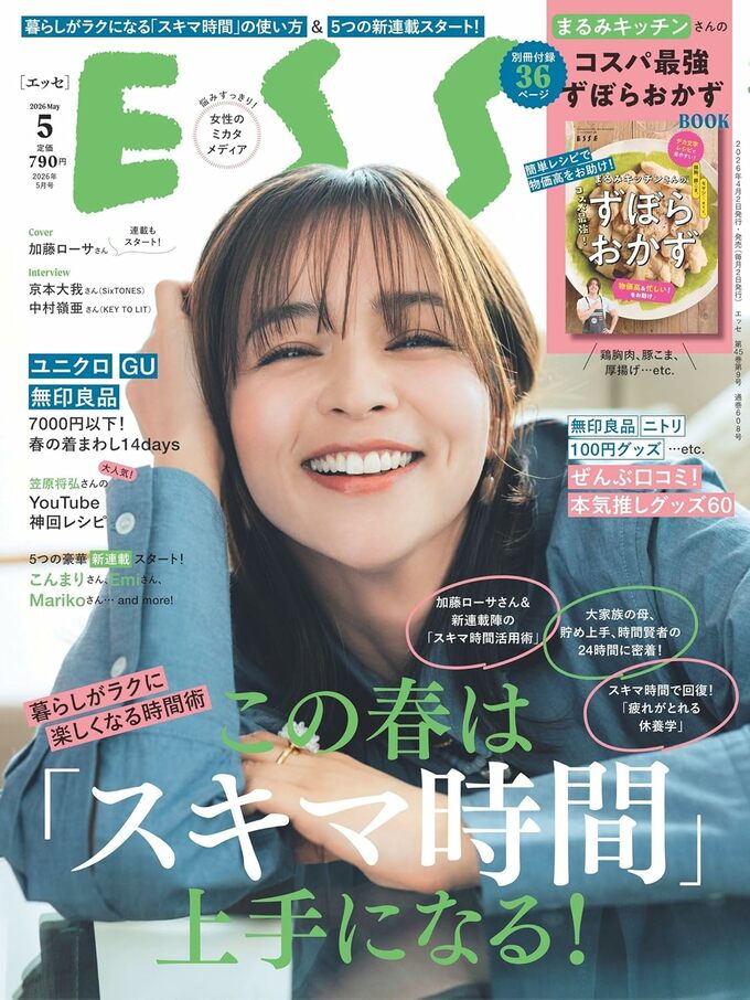 ESSE5月号の特集『スキマ時間上手になる!』では、ちょっとのスキマで生まれた時間を上手に使って、毎日の暮らしや自分の心と体を、もっとラクに心地よくするヒントをお届け。スキマ時間上手3人の実例や、スキマ時間で疲れがとれる休養学など、盛りだくさんの内容です。ぜひチェックしてみてくださいね!