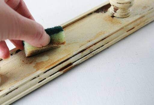 さらにより深いシャビー感を加えるため、水で薄めたステイン塗料をスポンジで押さえるようにして所々にポンポンと付着させます。