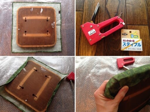 「タッカー」と呼ばれるホッチキスのような道具を使って、好みの柄のクロスを座面に留めていきます。