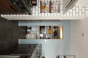 ダクトレールや吊り戸棚のアイアン、壁のブルーがいいアクセントになっていますね。