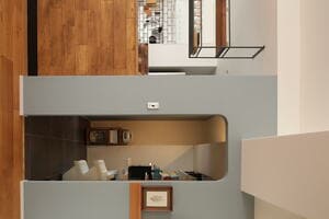 LDK入口は引き戸で、すりガラス入りです。そのすりガラスを通してLDKからの光が廊下にもやさしく漏れてきます。寝室のW.I.Cがあったところは、夫の書斎にしました。「完全に閉じた空間にはならないように」という妻の希望から、リビング側に内窓をつけています。