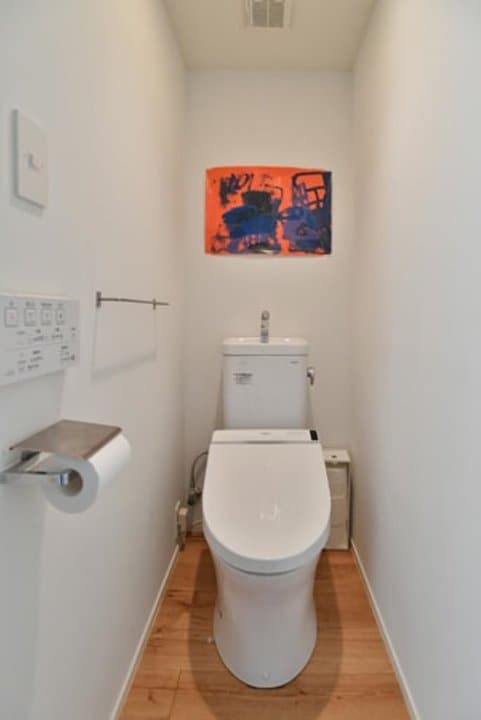 洗面ボウルだけのシンプルなタイプにすることで、洗面脱衣室にはゆとりが生まれました。トイレもシンプルな雰囲気ですが、正面に飾った長男の作品がアクセントになっています。「やっぱりお気に入りはランドリースペース」と口を揃える夫妻。