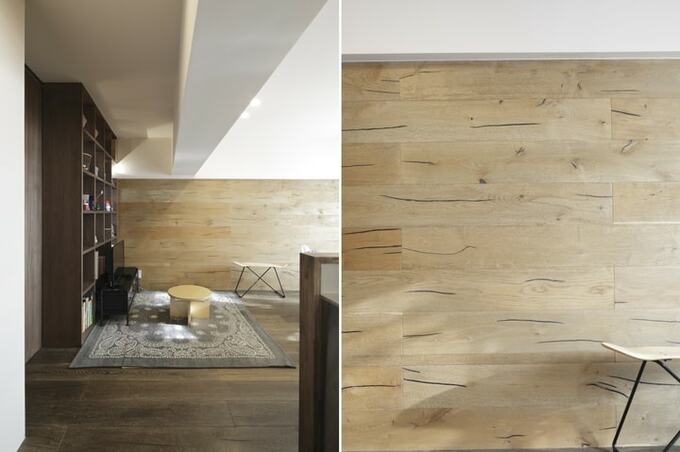 また、LDKの壁には存在感のある古材風のフローリング材を張って、家のトレードマークに。床にもエイジング感のあるフローリングを選び、雰囲気を合わせています。最上階なので天井を高くすることができ、解放感あるLDKに仕上がりました。