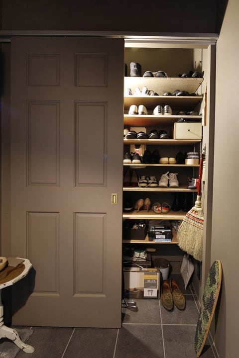 玄関まわりに置きたい物を一手に引き受けているのが、この収納です。内部には天井まで可動式の棚を設けて、物をたっぷりと収められるようにしています。