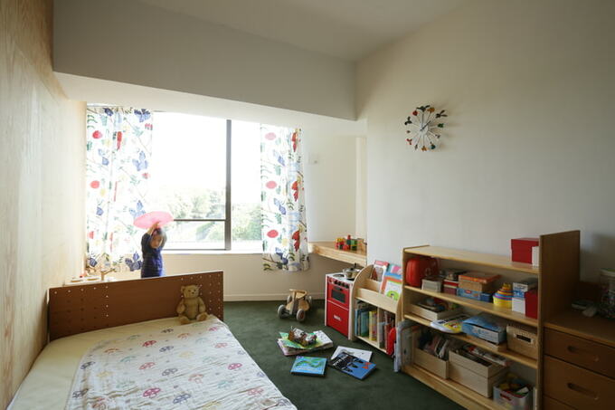 寝室の隣に位置する、明るく眺めのいい子ども室。カラフルなカーテンや木製の棚が、子ども室らしい雰囲気をつくっています。