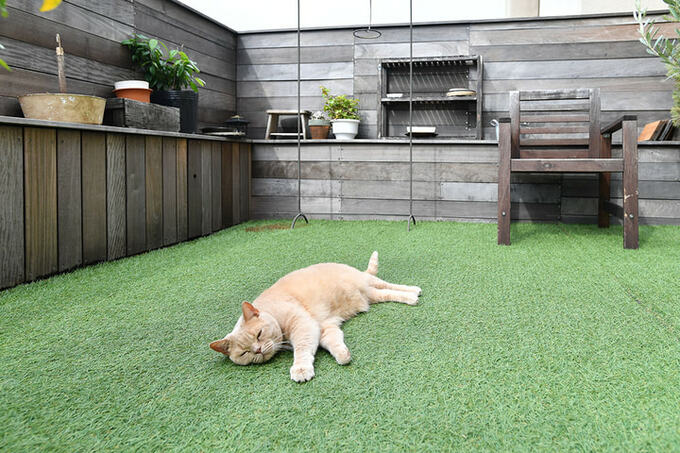 周囲は木のフェンスで囲み、床にはウッドデッキと人工芝を採用しています。このヴィンテージ感がたまりません!