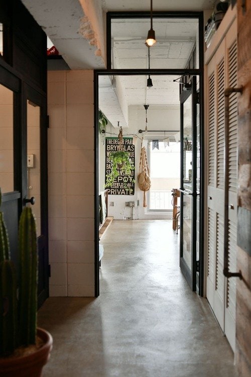 玄関はなくモルタルの床が廊下の先のDKまでつづき、ここでも家の内と外を曖昧に。土間のような雰囲気がクール!