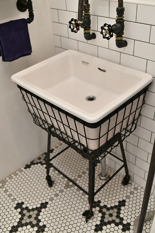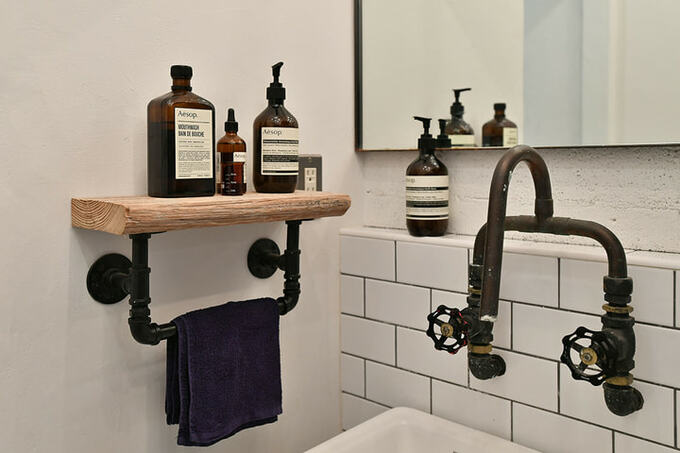 斬新な水栓もタオルハンガーも、もちろんオリジナル。インダストリアルな雰囲気が満載で、壁面のサブウェイタイルとの相性も抜群です!