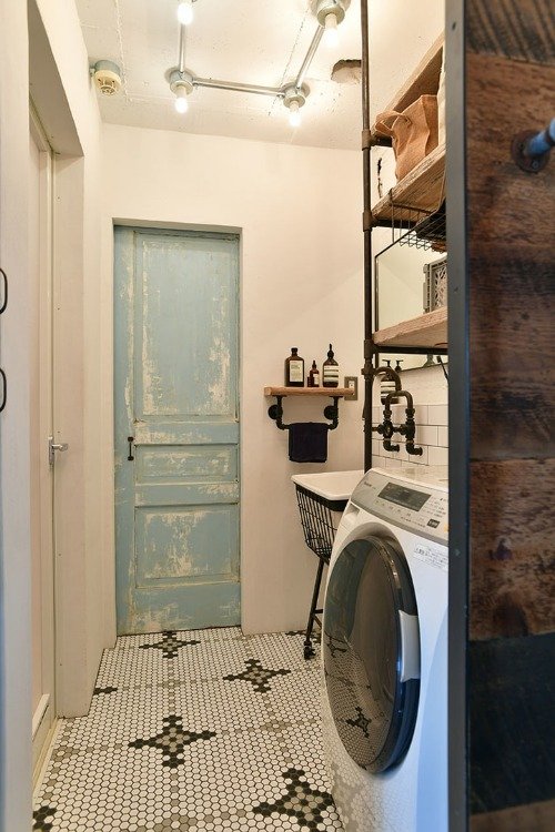 洗面室全体を眺めてみると、モザイクタイルを貼った床やシャビーなトイレの扉が印象的なサニタリーにうっとり。