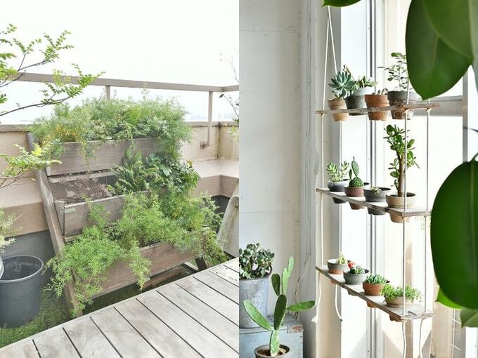 板とロープでつくられたグリーンシェルフ(写真右)は、板に穴を開けてミニチュアの鉢植えをポンポンとセットするシンプルな構造。