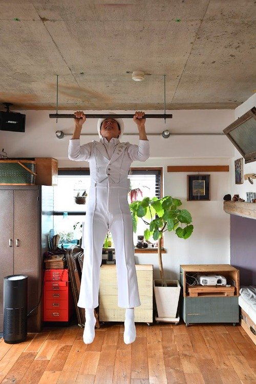 ソファの下は収納に。天井からバーを吊り下げ洗濯物干しに、そして時にはトレーニング用に(笑)!