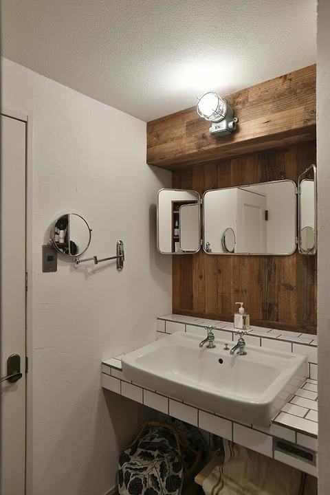 洗面室の壁にはスライスした足場板を採用。梁にも足場板を張ることで壁と一体化させ、存在感を抑えています。