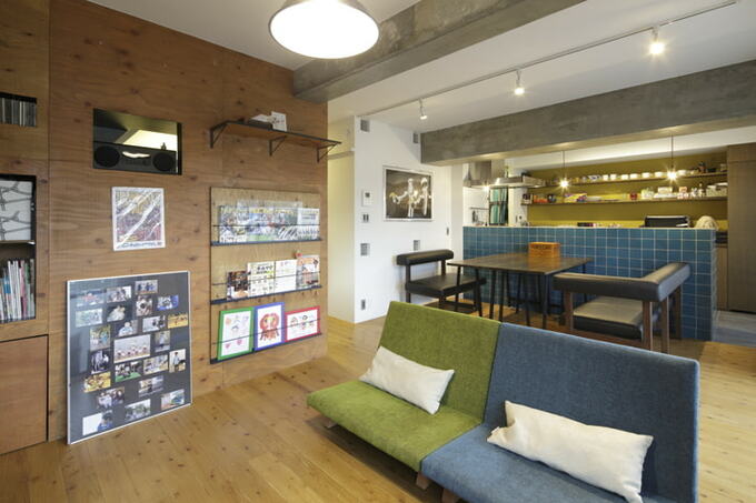 夫妻の家づくりの要望は、「男っぽい家」(夫)と「かわいい家」(妻)という一見相反するものでした。その要望が叶ったというLDKは、コンクリートの躯体現しやラフな構造用合板を使った内装に、キッチンのイエローの壁やブルーのタイル、カラフルなソファなど女性らしい色使いで華やかさがプラスされた空間。