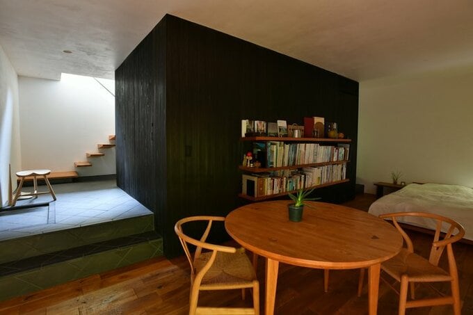 左手の玄関から2段下がった寝室は、光量を抑えた落ち着いた雰囲気の空間。明るい階段側との対比も印象的。
