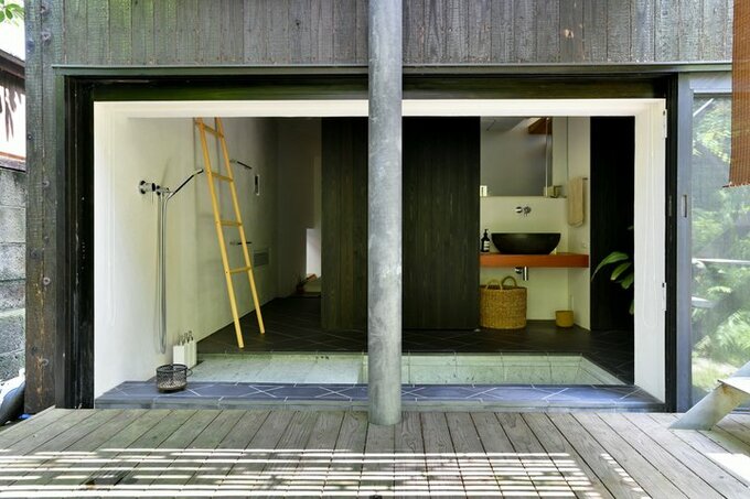 テラスからバス空間を見たところ。左奥は寝室への通路で、壁のはしごは入浴時に着替えを掛けておくために利用。正面の黒い扉には洗濯機も隠れています。