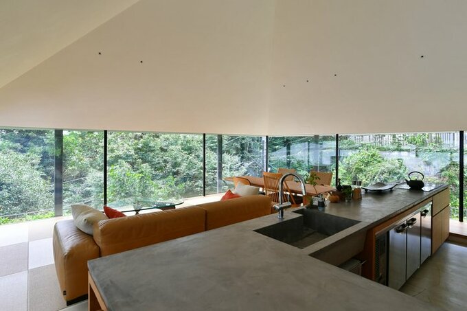 遠くの山まで見渡せる東側に向けてキッチンを配した2階LDK は、ガラスで囲まれた開放的な空間。開口部は石井さん夫妻の目線の高さ=1.6m に設定され、適度なこもり感を実現していますが、ソファや畳敷きの床に座ると空まで見渡せて一気に視界が広がります。