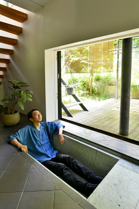 テラスとつながるオープンな空間で、「浴槽につかると、ちょうどモミジが眺められます。夏は風が抜けて気持ちがいいので、窓はフルオープンに。網戸もあるのですが、うっとうしいので代わりに蚊取り線香をたいています」と石井さん。