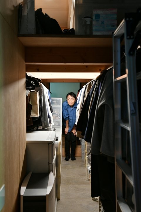 玄関側から反対側へ通り抜けられるウォークスルークローゼット。内部は上下に分かれていて、洋服以外のものもたっぷり収納されています。「クローゼットの中を通り抜けられて、お風呂に入るときも、出掛けるときも便利なように考えられているのが素晴らしいですね」と、優れた動線にも感心する田中さんでした。