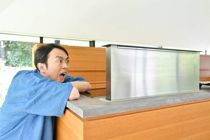 「これ換気扇なの!?」とびっくりする田中さん。昇降式の換気扇は、普段カウンター内に収まっているので空間がスッキリ。
