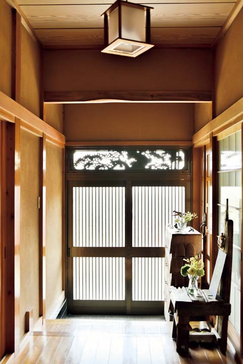 手の込んだ欄間が造り付けられた玄関。左手のガラス扉を開けるとリビングです。リビング内にもたけちゃんの作品が。