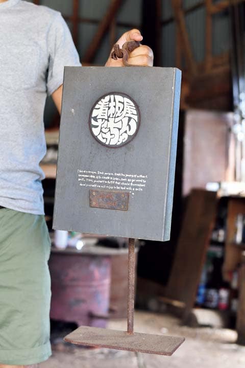 たけちゃんこと、福島毅さんの職業は看板屋。看板の材料とするのは、海岸で拾ってくる流木や廃材など。いわばスクラップです。