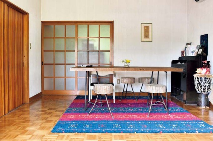 たけちゃんが廃材を利用して制作したダイニングテーブル。天板は欠き込みがあるラフな木材なので、鉄パイプを加工した脚と組み合わせ、絶妙な表情になりました。右奥に見えるオルガンは、昔の小学校にあったような趣。古道具店で購入したそうです。