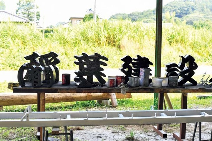 こちらは建設会社からのオーダー。鉄で組み立てた文字の表面に廃材のビスや金物を隙間なく取り付けていきます。
