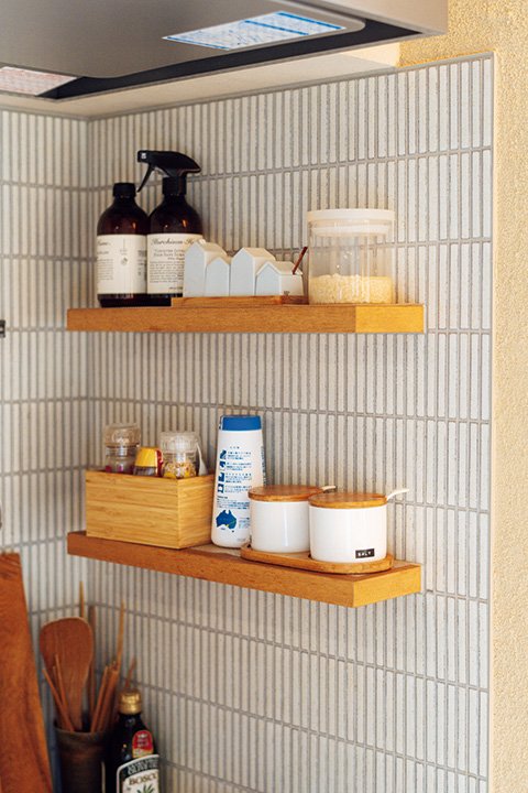 調理中にさっと調味料が取れるよう、奥行きの浅い棚を2段設置。