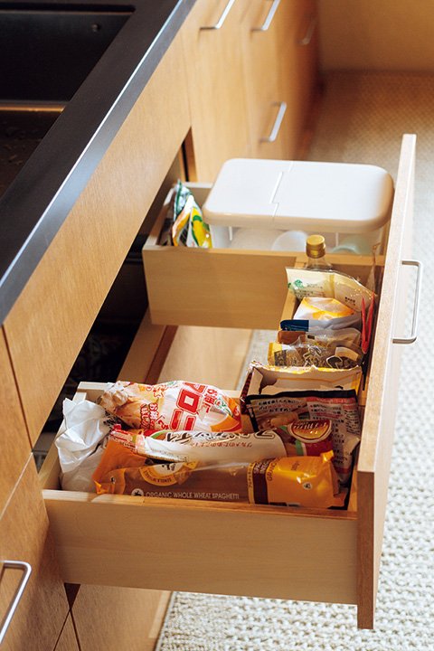 シンク下は配管が通っているためデッドスペースになりがち。そこで配管を避けるようにコの字型の引き出しをつくって収納力をアップ。