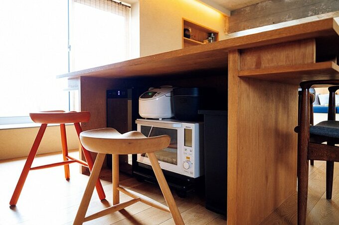 ダイニングテーブル下の空間を生かした調理家電&ゴミ箱収納スペース。
