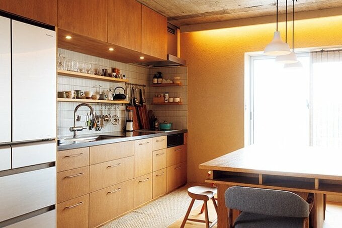 ダイニングテーブルとキッチンの面材にはラワン材の合板を使用。木材を統一することで、穏やかで落ち着いた雰囲気に。