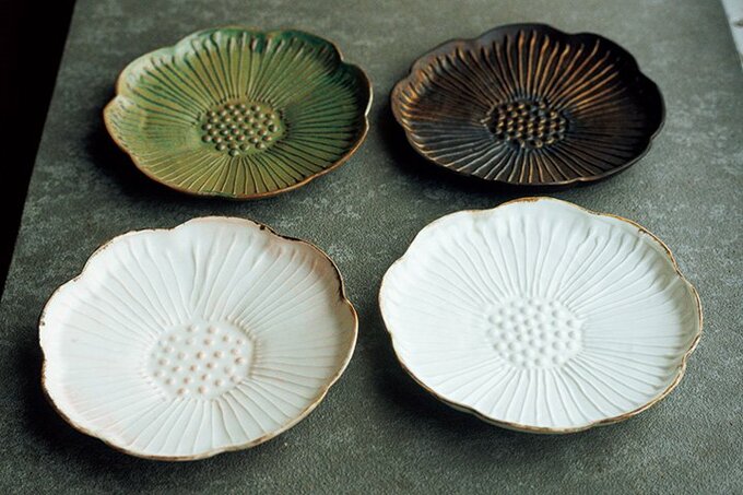 器作家・中村かおり氏の花をモチーフにした薄くて繊細な器。大福など和菓子をのせて。