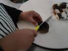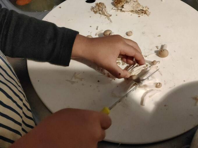 子どもに本物の包丁を贈った日〈今日はなにを手に取ろう?〉 記事に戻る スクロールで次の画像 (画像 1/6) この記事を読む 貝印の子ども用包丁。パンダのマークがチャーミングだ。 (画像 2/6) この記事を読む シイタケをぱっくり、半分に。「猫ちゃん」が崩れかけてはいるが、なんとか上手にできた。シイタケは表面がすべらないから切りやすそうだった。 (画像 3/6) この記事を読む シメジは数本をまとめて切るので、シイタケより難易度アップ。エノキはもっと細くてバラバラしているので、私が代わりに切ってあげた。 (画像 4/6) この記事を読む たっぷり刻んだキノコをフライパンで炒める。火がとおればかさが減って、ちょうどよいあんばいに。ツヤツヤでおいしそう。 (画像 5/6) この記事を読む 1歳のときに贈ったオモチャの包丁。ずいぶん活躍したので、合掌して処分します。 (画像 6/6) この記事を読む ちなみにこれは、まだ包丁が使えなかった幼い頃のお手伝い。白瓜のみそ漬けを「おいしくなあれ」と言いながらもんでいるところ。