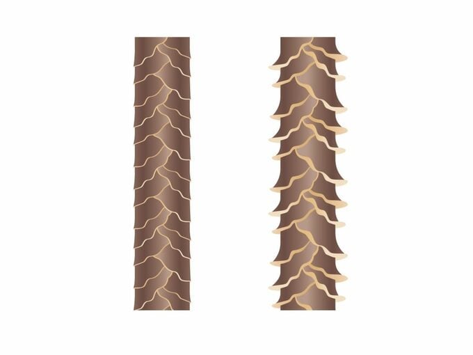 健康な髪(左)と、キューティクルがはがれたダメージ髪(右)