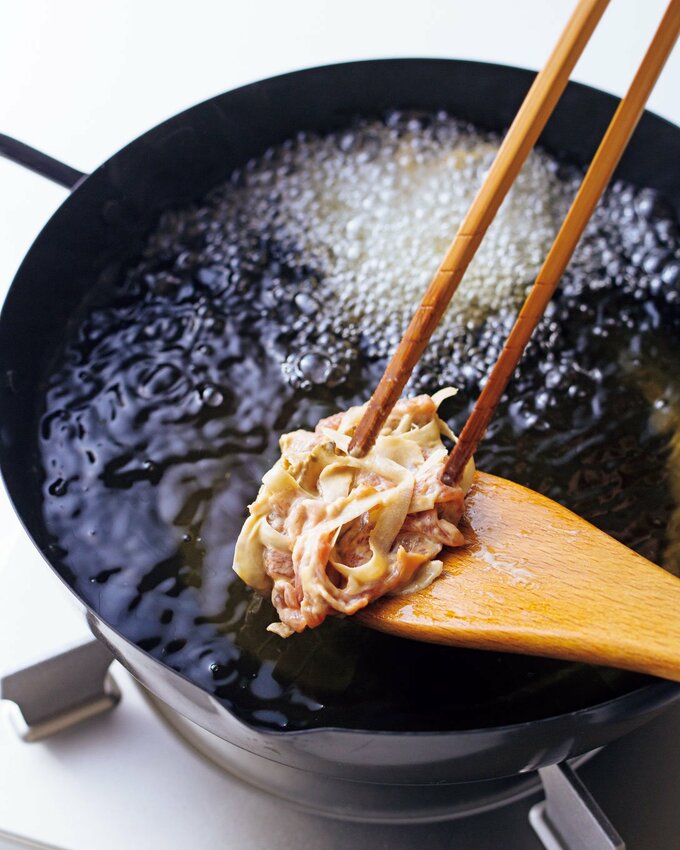 豚こま肉とゴボウのかき揚げ。カリッとした食感がやみつき 記事に戻る スクロールで次の画像 (画像 1/2) この記事を読む 1人分¥100! (画像 2/2) この記事を読む 木べらから滑らせるように入れて