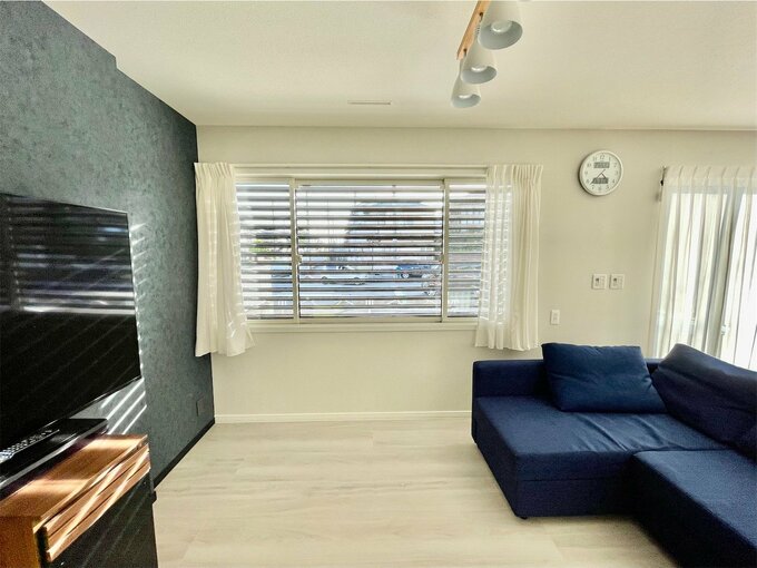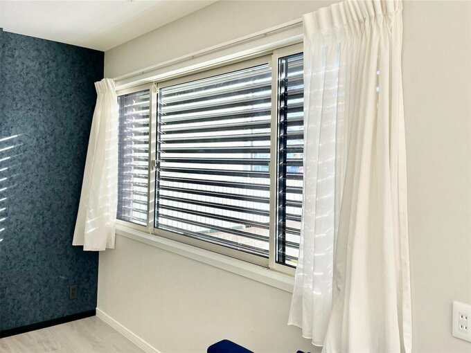 リビング西側にある大きな窓。電動シャッターブラインドは開けた状態