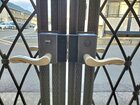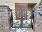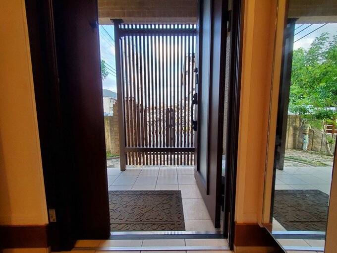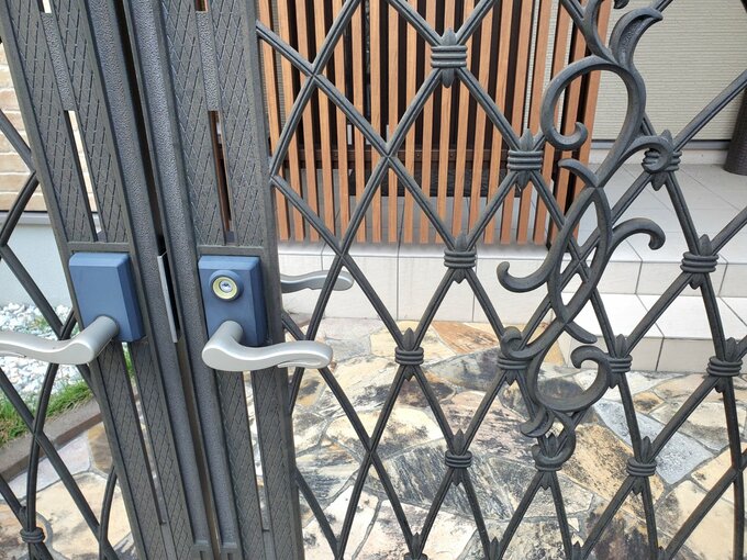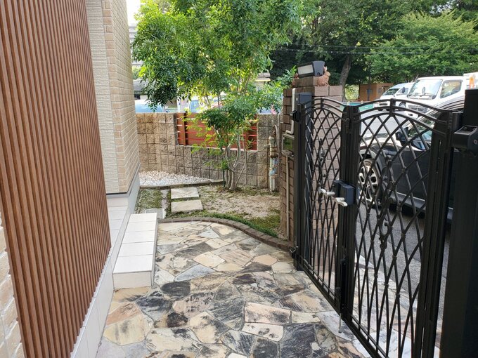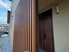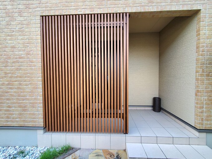 アイアン扉と縦格子の目隠しの組み合わせて、玄関が丸見えにならず、洗練された印象に