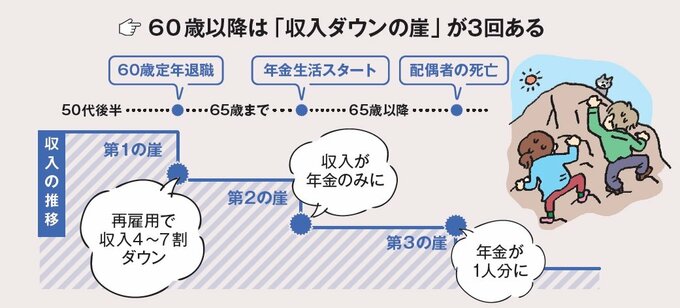 60歳以降に3回ある「収入ダウンの崖」。乗り越えて老後資金を貯めるコツ 記事に戻る スクロールで次の画像 (画像 1/2) この記事を読む 老後破産しないために今からできること(写真はイメージです) (画像 2/2) この記事を読む 家計を襲う『収入ダウンの崖』とは