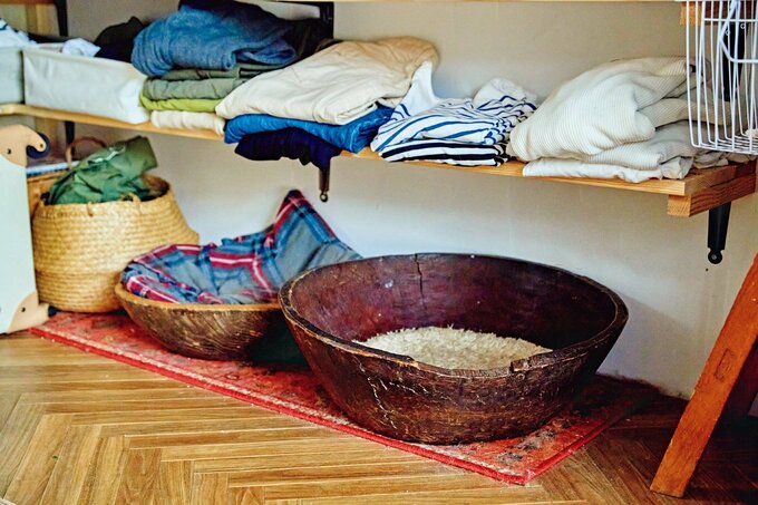 ベッド代わりのアンティークのこね鉢