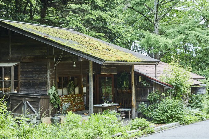 「蓼科ハーバルノート・シンプルズ」外観。もとは開拓農夫の小屋だったという店舗の裏にはハーブと木々の庭が広がる