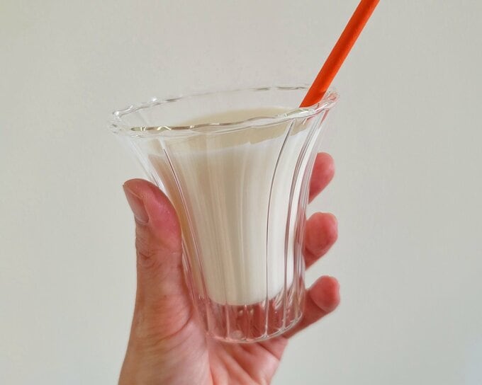 「スターバックス トロピカルフルーツミックス with マンゴープディング」をグラスに注いでみました。マンゴープディングの食感も楽しいデザートドリンクです