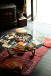 本棚の前のガラスのテーブルに、好きな本を並べて。山荘はとてもリフレッシュでき「ガッツリ本を読むぞ」と来ることもしばしば。取材の日は、自身でプロデュースする朗読劇のために本の選定作業中だった