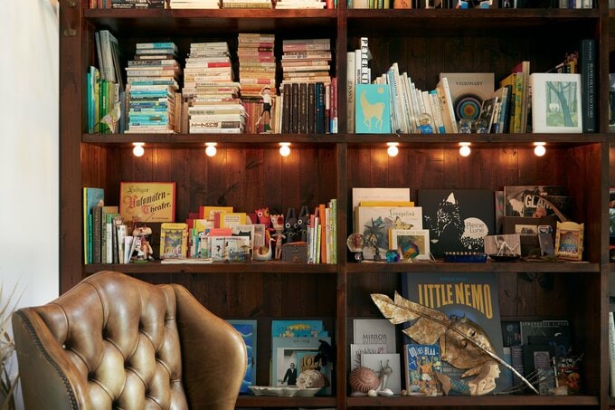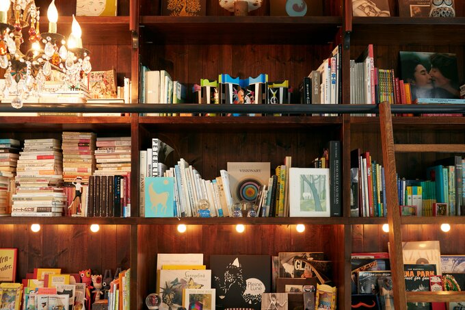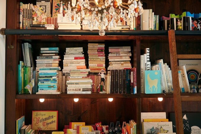 写真は文庫が「みっちり」詰まったコーナー。「いまの私をつくってくれる本が並んでいます」。背表紙を色別に重ねるアイデアがすてき