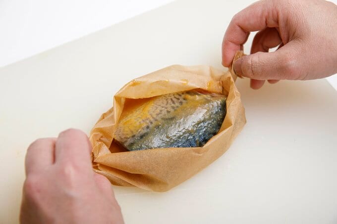 サバはクッキングシートにのせ、両端をねじって舟形の器にする。そのあとにAの調味料をかける。